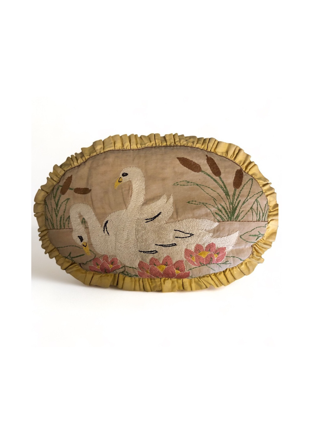 Élégant coussin ovale brodé, orné de délicats cygnes. Une pièce vintage unique pour sublimer votre intérieur avec charme et authenticité.