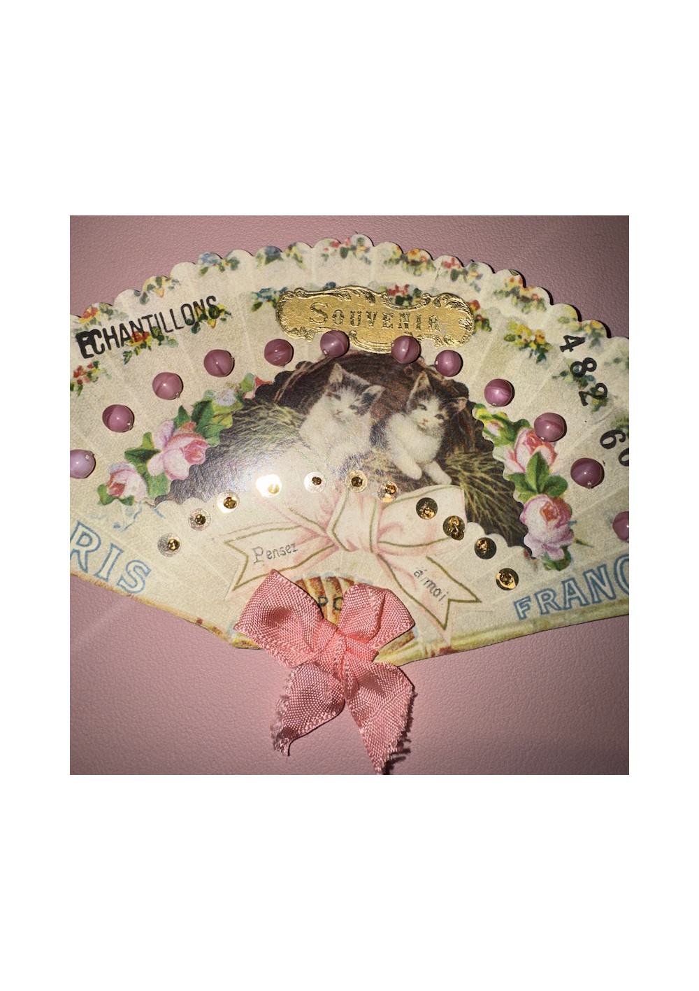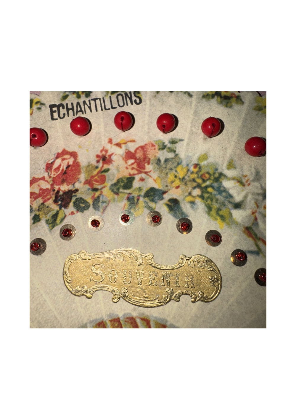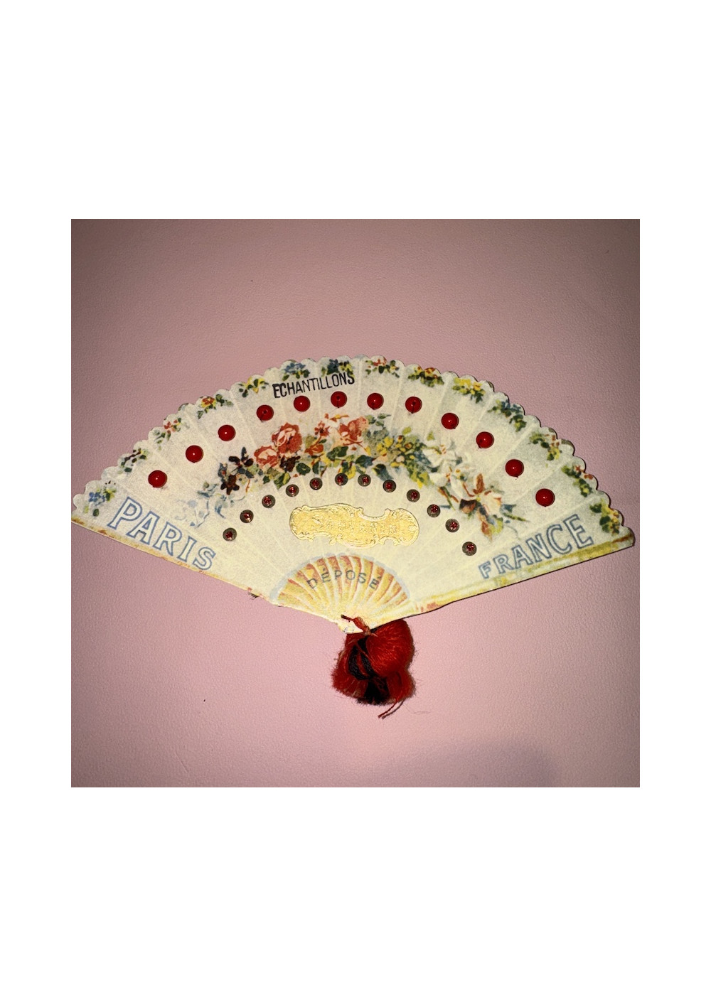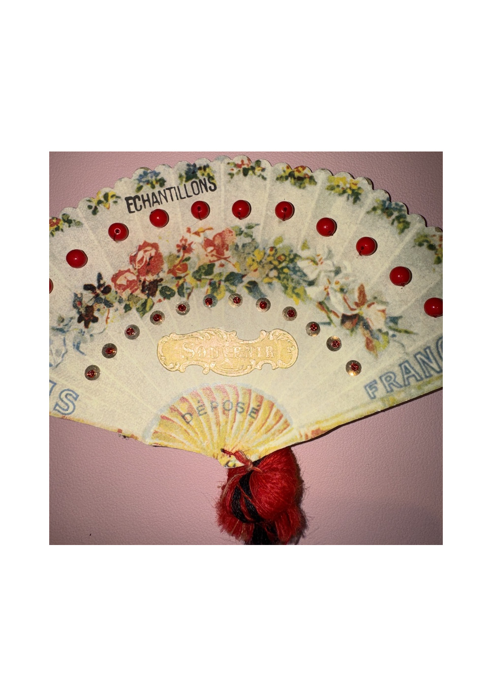 Multicolored floral bead sampler, cardboard. Good condition, shabby chic style. Pre-owned item found in Paris, perfect for DIY, decor, and vintage storage.