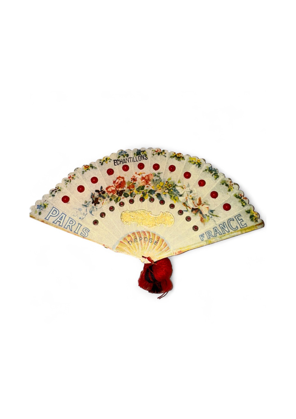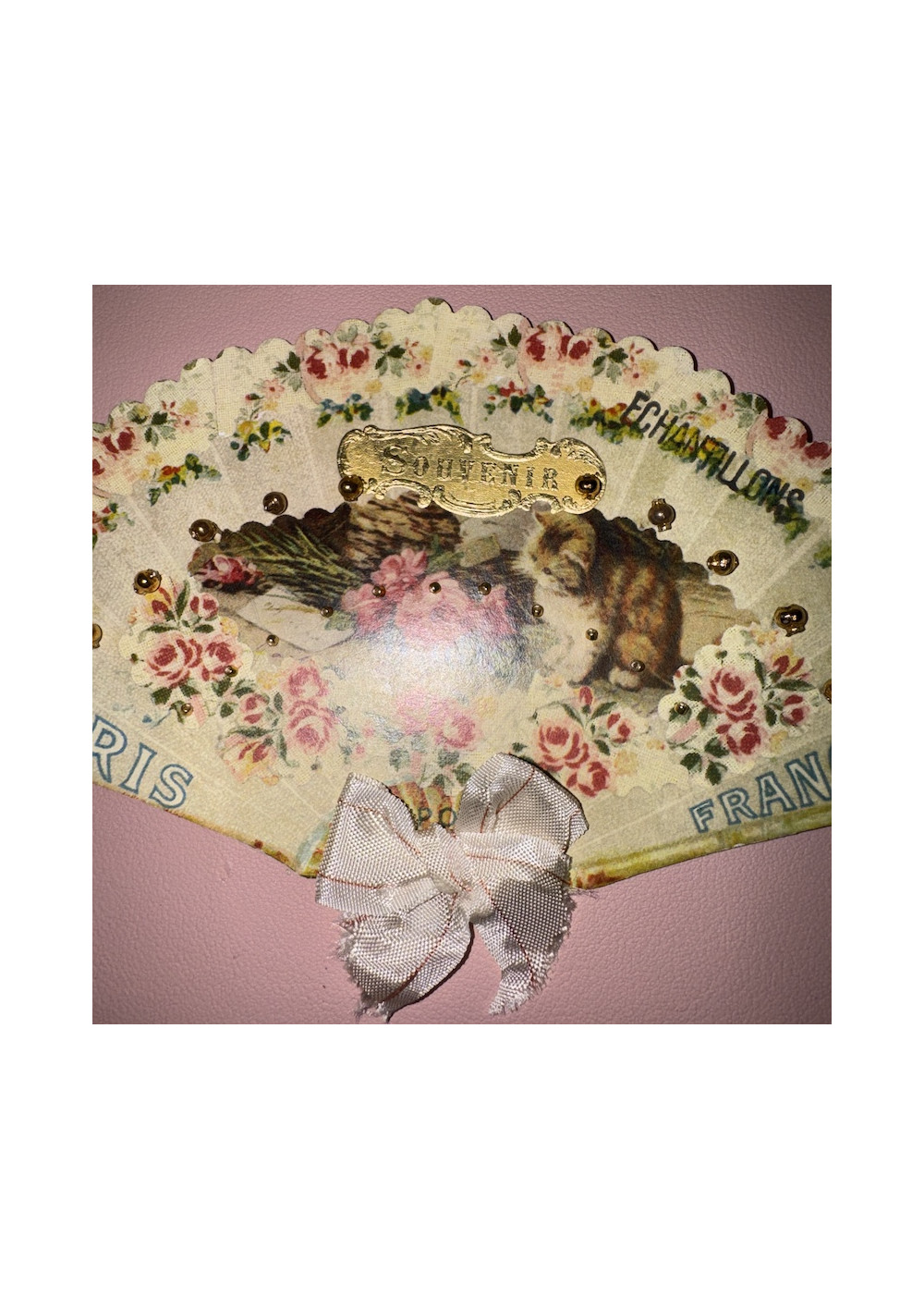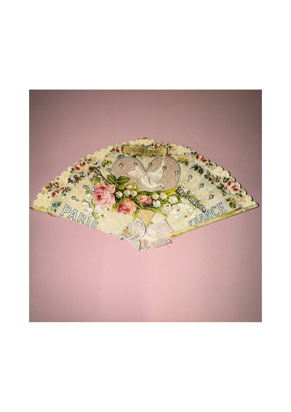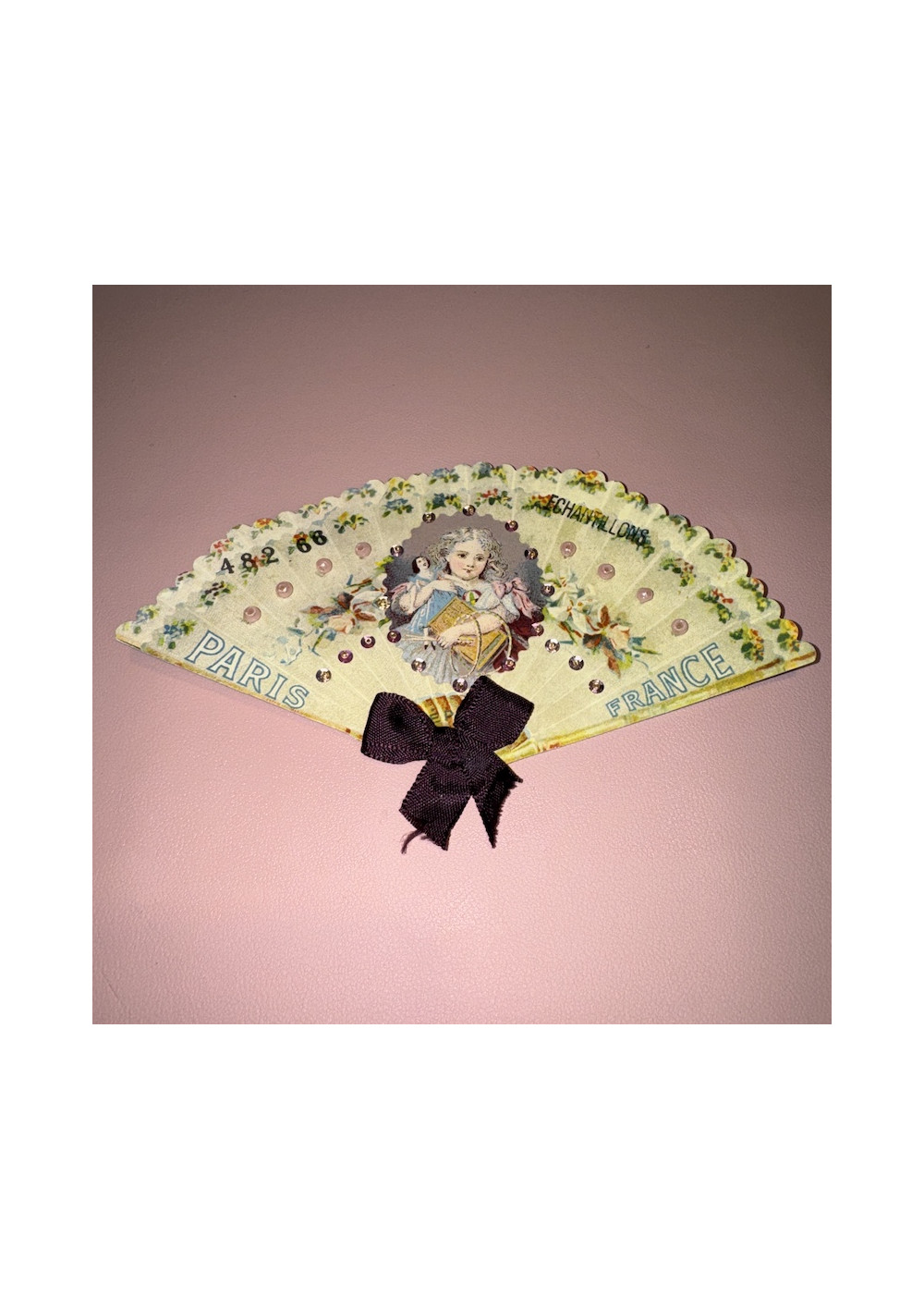 Multicolored floral bead sampler, cardboard. Good condition, shabby chic style. Pre-owned item found in Paris, perfect for DIY, decor, and vintage storage.