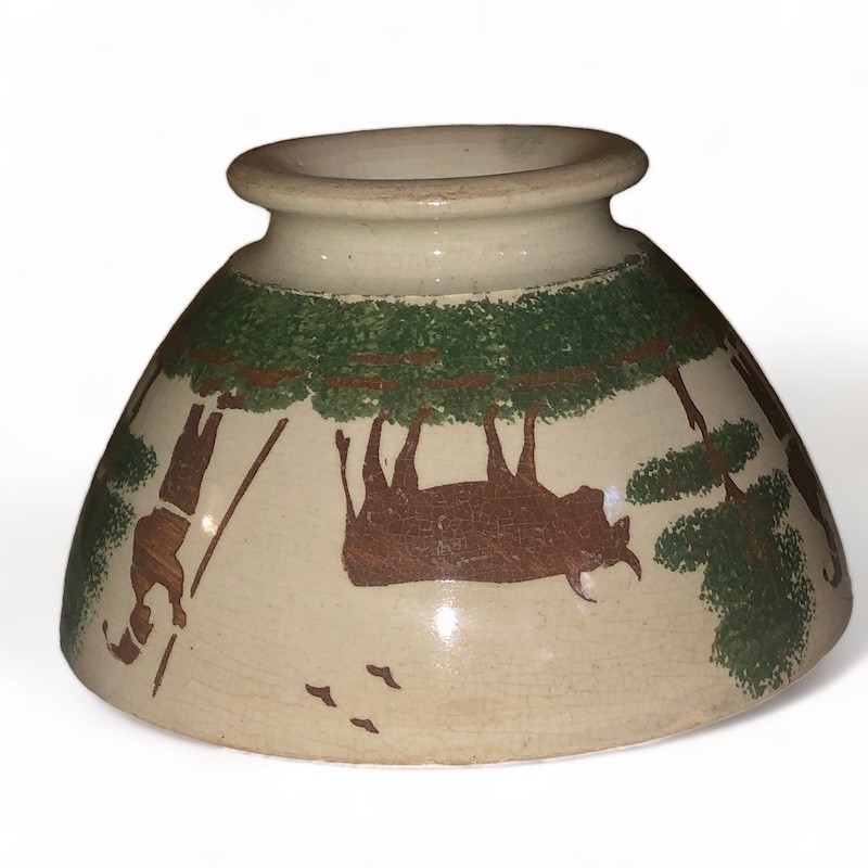 Explorez l'authenticité rustique avec notre Ancien Bol Choisy-le-Roi en Terre de Fer, orné d'un décor représentant la vie champêtre avec un paysan et sa vache.